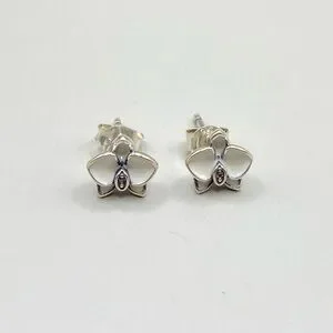 Pandora sterling silver white enamel and purple cubic zirconia orchid post earrings. Good used condition with some light wear, backs are sterling but not Pandora.