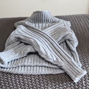 Embrace warmth and style with this H&M gray sweater, featuring a cozy cowl neck and a chunky ribbed knit pattern. The cropped design offers a modern touch, while the relaxed full-length sleeves ensure comfort. Perfect for layering on chilly days, this sweater is a versatile addition to any wardrobe.