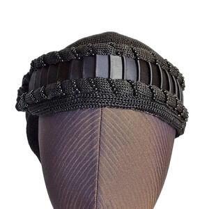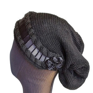Vintage 40s Black Knit Beaded Snood Satin Rosette Detail