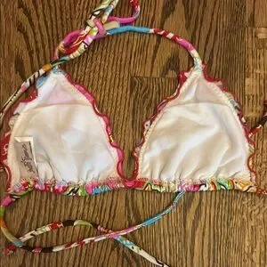 Triangle top (size XS) has wavy lettuce edging, adjustable ties and removable pads