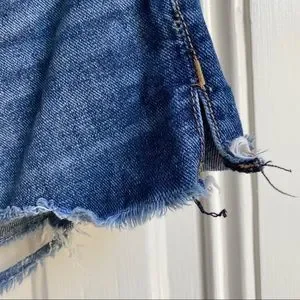 Blue Dark Wash Distressed Cut-Off Denim Jean Shorts by Free People. Distressed look. Waist across 17”, Rise 10”, Inseam 3”. Fabric/care tag is worn/unreadable. Great preowned condition.