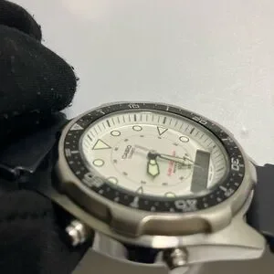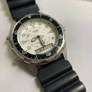 Used vintage Casio dive watch. Arnie. White dial. Analog and digital both working. New Renata brand battery installed 4/4/2025. Bezel clicks both directions without issue.