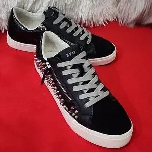 Elevate your style with these chic black studded sneakers. Perfect for adding an edgy touch to any outfit.