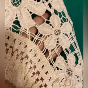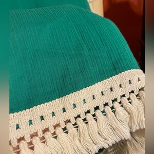 Such a cute boho dress from Umgee. Emerald green with crochet lace sleeves and fringe trim. Perfect for a summer fashion look. Dress is lined. Pair with your favorite sandal. Effortlessly ready to go on a lunch date or early evening dinner! Excellent preloved condition. Size Small.