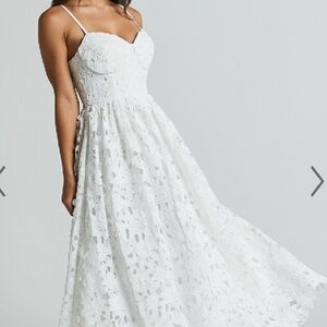 This elegant white midi dress by Showpo features a romantic sweetheart neckline and delicate spaghetti straps, perfect for a bridal occasion. The fit and flare style accentuates the natural waistline, creating a flattering silhouette. Its sleeveless design and flowing skirt make it an ideal choice for engagement photos, parties, or rehearsal dinners.