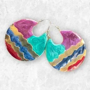 Vibrant earrings featuring a blend of purple, teal, and gold hues. Perfect for adding a pop of color to any outfit.