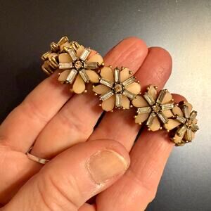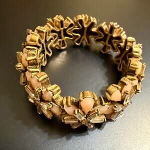 This is a lovely light pink floral crystal beaded stretch bracelet by J.Crew. It's in strong condition with all stones intact and should comfortably fit wrists slightly smaller wrists up to 7.25 or so.