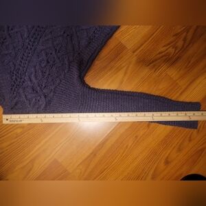 💜size XS. Free People in general is known to be an oversized brand, but the arms on this top are small, so keep that in mind. in the color Deep Orchid, which is a dark purple. curved raw cut/unfinished high-low hem with some gentle fraying. open stitch cable knit design on the front with ribbed long sleeves. v neck neckline in a relaxed fit, made of 100% cotton