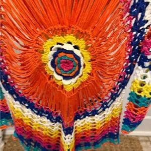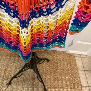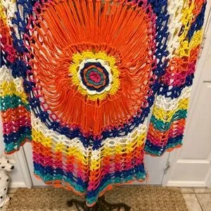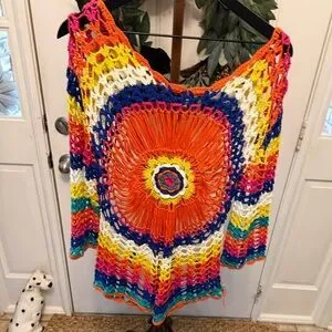Colorful Boho Hippie crochet open knit top topper coverup swimsuit coverup, scalloped neckline, 3/4 length sleeves, rounded hemline with scalloped edge, bright and cheerful colors! (No materials tag)