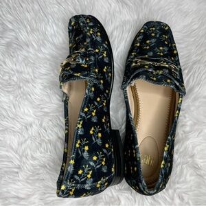 Floral women’s velvet loafer flats with gold hardware on front and round toes. Pre-owned and is in excellent condition.