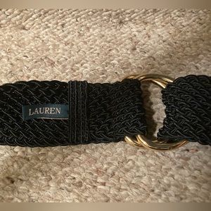Black nylon woven belt with gold-tone hardware. Size Large. 44" long x 2" wide. NWOT