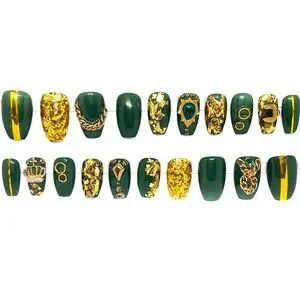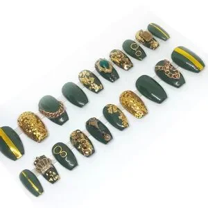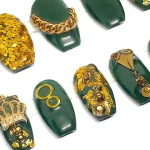 Handmade Press on Nails UV Gel Medium Short Coffin Green & Gold Shiny Fu…
