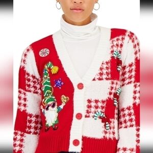A mixture of plaid and fun holiday graphics evoke the season on Hooked Up by IOT's cute, comfy cardigan.