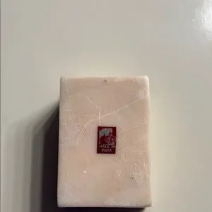 Elegant soapstone dish with a pink floral inlay. Features green leaves and a cream base.