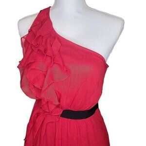 Stunning Red Dress One Shoulder Asymmetrical Skirt Black Belted Style Date Night