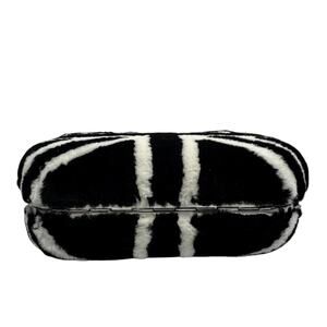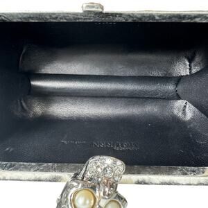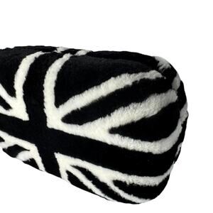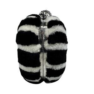 • Rare limited edition collectible piece featuring UK flag in black and white mink fur, crystal encrusted silver skull clasp closure, pearlescent eyes, leather interior, roomy handheld case. Framed hard-shell design with rounded corners.