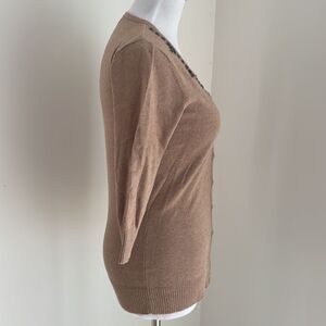 Beautiful button-down light brown sweater and three-quarter sleeve with gray and gold beating around color