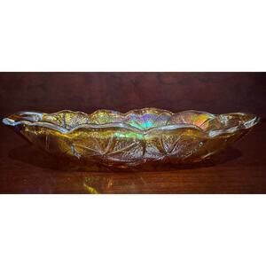 Vintage Carnival Glass Serving Dish Iridescent 9.5” Amber Gold Sunflower Design