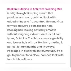 Redken Outshine 01 Anti-Frizz Polishing Milk is a lightweight finishing cream designed to smooth hair, control frizz, and add shine.