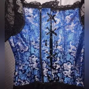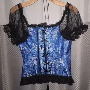 blue and black corset with zip up back closure lace puff sleeve with dot details