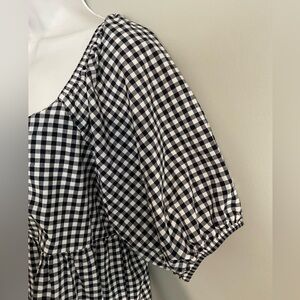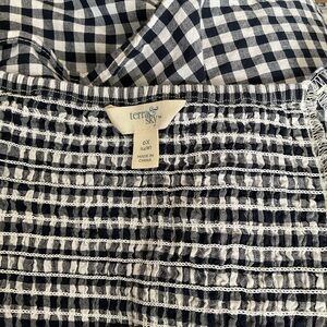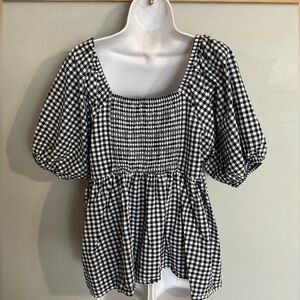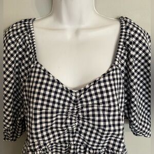 Terra & Sky navy and white babydoll top. Gathered center front bodice