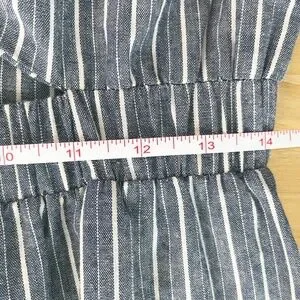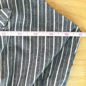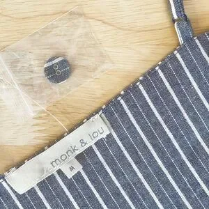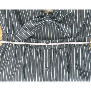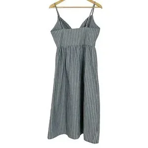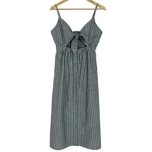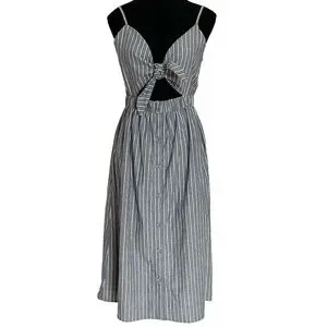 This cotton breezy Monk & Lou dress features woven navy and white vertical stripes, a flattering front tie with a cut-out detail, and a button-down midi skirt. Adjustable spaghetti straps and an elastic waistband to add comfort. Ideal for summer days (because it's coming!) or casual gatherings. Add a white t-shirt underneath for a layered look.