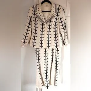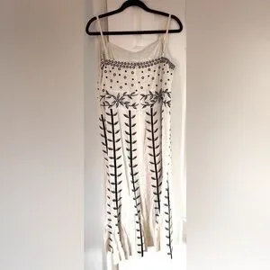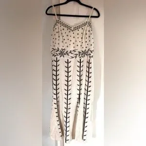 This sleeveless sundress features a delicate blend of cream and white hues, perfect for a wedding guest occasion. The spaghetti straps and floral motifs add a touch of elegance, while the geometric patterns provide a modern twist. Its lightweight fabric ensures comfort and style throughout the event.