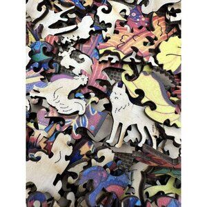Wooden Jigsaw Puzzle Alluring Fox Rainbow Odd Shapes Complex Pieces. This is a wooden jigsaw puzzle in a wood box that has a stand that can be attached to the back. The sticker on the front of the box has some bubbles in it. The major issues is that there are by my count 5 pieces missing. Please see the pictures for the full description.