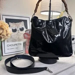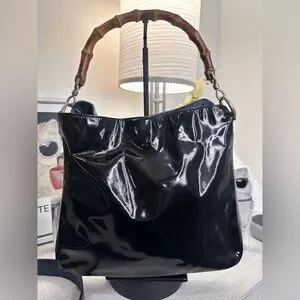 Gucci Elegant Black Patent Leather Bag with Bamboo Handle