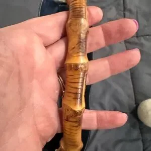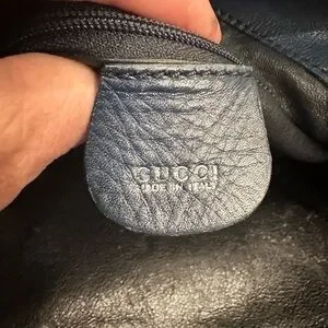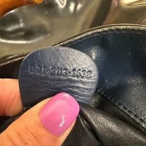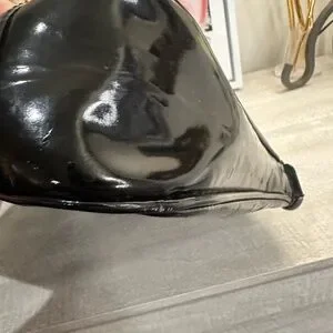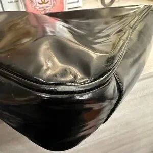 This stylish black patent leather bag features a unique bamboo handle, perfect for adding a touch of elegance to any outfit. Ideal for both casual and formal occasions. See pics for callouts. Some rubbing on corners and scuffs on the leather.