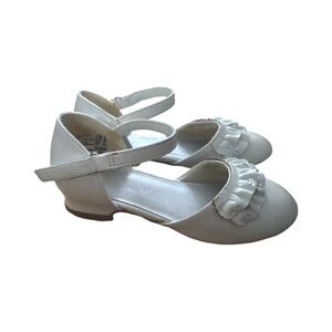 Charming white Mary Jane shoes with ruffled detail and ankle strap. Perfect for special occasions.