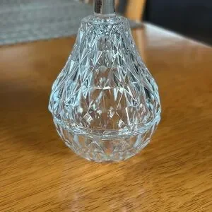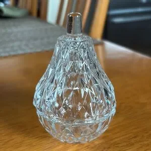 This vintage clear glass trinket dish in the shape of a pear is a beautiful addition to any collection. The diamond pattern and lid make it perfect for storing jewelry or small keepsakes. Made in Italy, this trinket dish has a unique 1940's style and is ideal for all occasions. Measuring 4 1/2 inches in height and 2 1/2 inches in width, it is the perfect size for a small trinket.