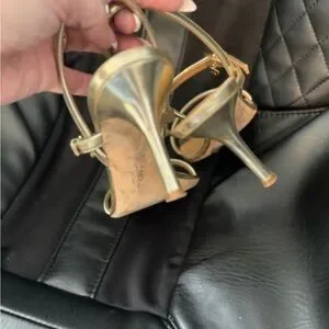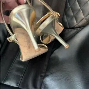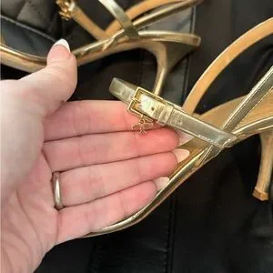 Step out in style with these elegant gold strappy heels. Perfect for any occasion, these shoes offer both comfort and sophistication.