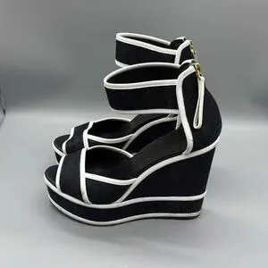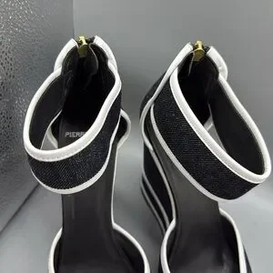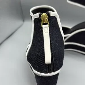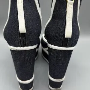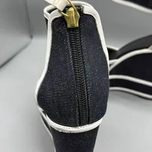 Pierre Hardy’s sandals are made from midnight-blue denim and accented with graphic white leather trims. The vertiginous wedge heel is tempered by a high platform, making them wearable for day or evening. A discreet zip fastening at the back keeps the sleek lines in focus