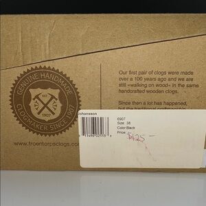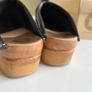 Authentic handcrafted, wood and leather black clogs. European size 38 fits like a slightly small 7 1/2. Some scuffing and wear on the wood and the rubbery soul, see photos. Textured polyurethane soul helps with comfort and traction. Very comfortable and fun to wear.