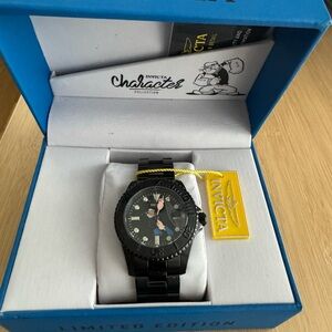 New condition with boxes and papers, never used. This a limited edition Popeye watch in a gun metal black stainless steel case, face and bracelet. Uni-directional rotating black top ring stainless steel bezel. Black (popeye) dial with luminous silver-tone hands and dot hour markers. Minute markers around the outer rim. Dial Type: Analog. Luminescent hands and markers. Date display at the 3 o'clock position. SII Caliber NH35A automatic movement with a 41-hour power reserve. Scratch resistant mineral crystal. Screw down crown. Transparent case back. Round case shape, case size: 43 mm, case thickness: 14 mm. Band width: 20 mm, band length: 8.25 inches. Fold over with safety release clasp. Water resistant at 200 meters / 660 feet. Functions: date, hour, minute, second. Casual watch style. Watch label: Japan Movt. Invicta Character Collection Popeye Automatic Black Dial Men's Watch 32809.