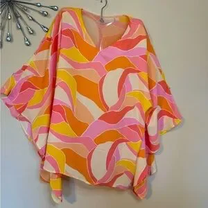 From the moment you slip into this prettily patterned poncho-style tunic top, you're on island time. It isn’t an open poncho. It has a fully fashioned armhole like a sleeve! Stitched lines give you shape so it is more of a tunic than poncho! My underarms were never visible when I raised my arms! Love that!! Take the day off from your everyday tanks and tees and opt for this lightweight, vibrant-print poncho that exudes simple elegance. Its breezy, billowy style makes it the perfect beach-to-bistro piece for that sun-and-sand vacay, pivoting easily from swimsuit cover-up to dinner and drinks with your fave pair of crops.
