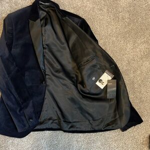 Here’s a H&M navy blue and black velvet blazer in size 38R and new with tags. It’s been in smoke-free storage.