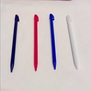 Lovingly enjoyed Nintendo 3DS XL handheld gaming console with four styluses in black, red, blue and white. Includes a charger for the device as well (previous owners initials are slightly visible on charger).
