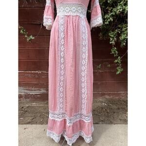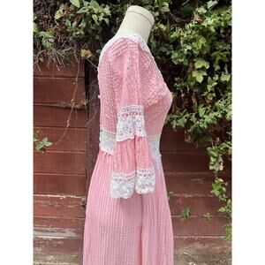 Vintage 60s Pink Lace Bell Sleeve Mexican Pintuck Wedding Bridal Maxi Dress