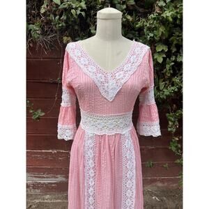 This beautiful vintage dress from the 1960s is a stunning pink lace bell sleeve Mexican pintuck maxi dress, perfect for a wedding or any bohemian-inspired occasion. The dress is handmade with high-quality cotton material, and it features a chest size of 35", a waist size of 27", and a hip size of 38". The dress has a unique and original style that will make you stand out from the crowd. It has a shoulder to hem length of 55". The dress is perfect for anyone who loves vintage clothing and wants to add a touch of bohemian elegance to their wardrobe. Get ready to turn heads with this beautiful dress from Mexico.