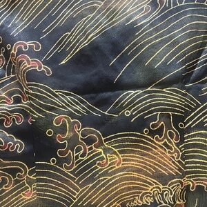 One-of-a-kind Asian-inspired sleeveless vest with traditional frog closures and a stand-up Mandarin collar. Features an intricate wave-like gold pattern with red hand-painted accents for added artistry. The interior is lined with soft black fleece or sherpa for warmth. Perfect statement piece for layering, boho, or festival style.