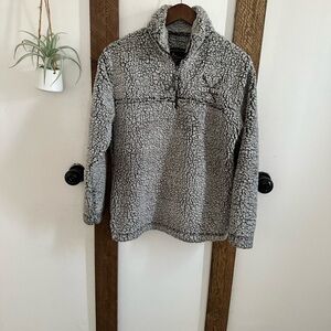 Cozy gray sherpa pullover with half-zip design. Features embroidered detail on the chest.