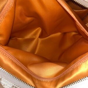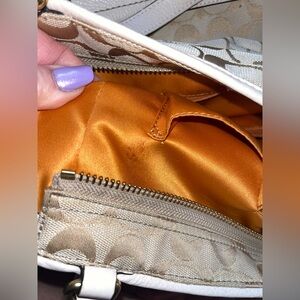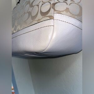 Elevate your style with this elegant Coach women's bag. Featuring a sophisticated cream and white design, it's perfect for any occasion. Some small fraying above zippy pocket and pockets inside bag, that doesn’t go all the way through. Great condition, beautiful bag with side pockets and dust bag included!