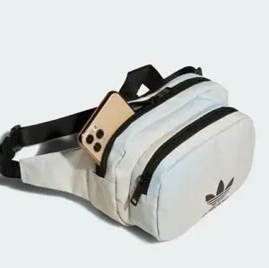 NWOT Adidas waist bag. Never worn. Dimensions: 8.5" x 3.5" x 5.5". 100% polyester (recycled). Wipeable lining for spot cleaning with soap and wate. Small front pocket with zip main compartment. Inner earbud and charger storage. Clip-lock strap closure. Can be worn as a waist bag or crossbody bag.