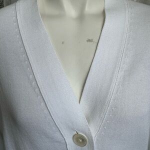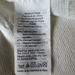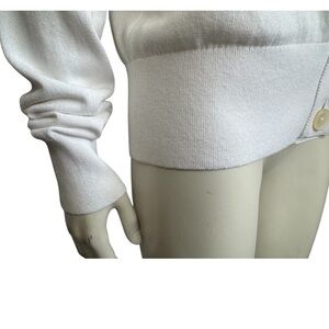 J. Crew white sweater in a cotton/viscose blend. Lightweight luxe fabric. Slight dropped shoulders. Fine ribbing at neckline, front placket, cuffs and hem. Great versatile, Summer staple for work or any casual outing. Beautiful condition.