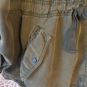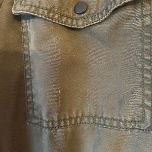 Super soft material with the ability to roll sleeves and cinch at waist. One small pull on front right pocket as shown in last photo. Great jacket that goes with everything!