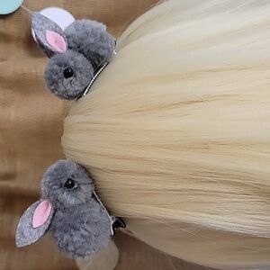 Sweet pompom rabbits with felt ears mounted on gentle tooth hinged hair clips.