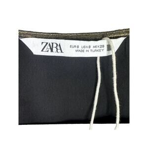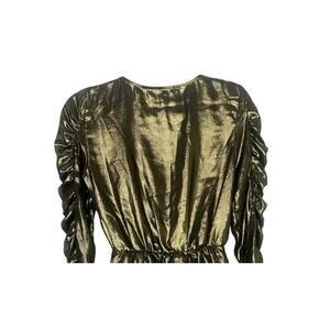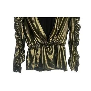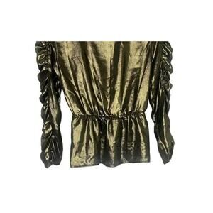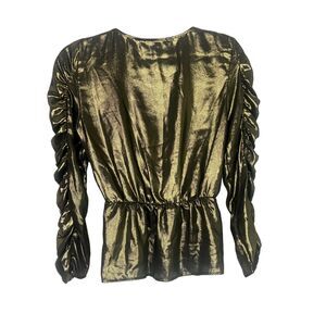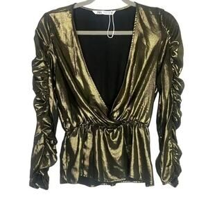 ZARA Metallic V Neck Ruched Long Sleeve Top Elastic Waist Lightweight S Gold