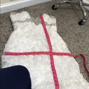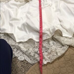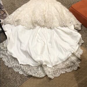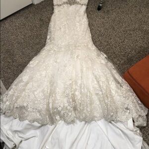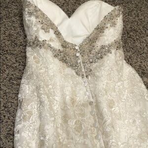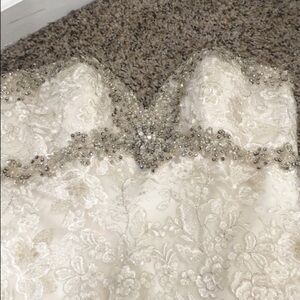 Good condition. Some slight discoloring mostly inside the lining and very slight dinginess on the bottom hem. Not noticeable unless inspecting very closely for flaws. The buttons are in groups of three but one group only has two buttons. I am not sure if this was part of the original design or if it’s missing buttons. Strapless, sweetheart neckline, padded and and boned, mermaid trumpet silhouette wedding gown with long train. Ivory floral lace with silver and gold lurex threads and clear sequins throughout and silver beads and rhinestones along the bodice with white pearls. Altered to fit like size 4.